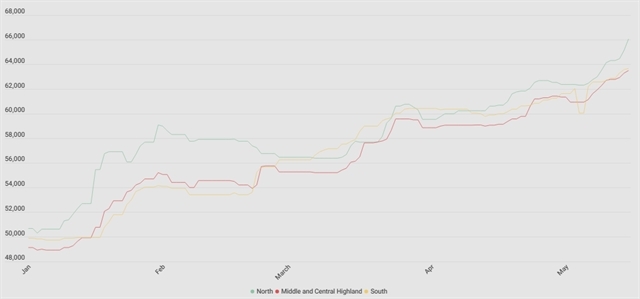 | Live hog prices in the three regions. Domestic hog prices are now trading around VNĐ64,000 - 68,000 per kg. Data and graphic: Ly Ly Cao |