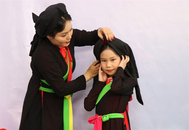| A 'quan họ' artist who is also teacher for the folk singing class rearranges the headscarf for a kid member of the club. |