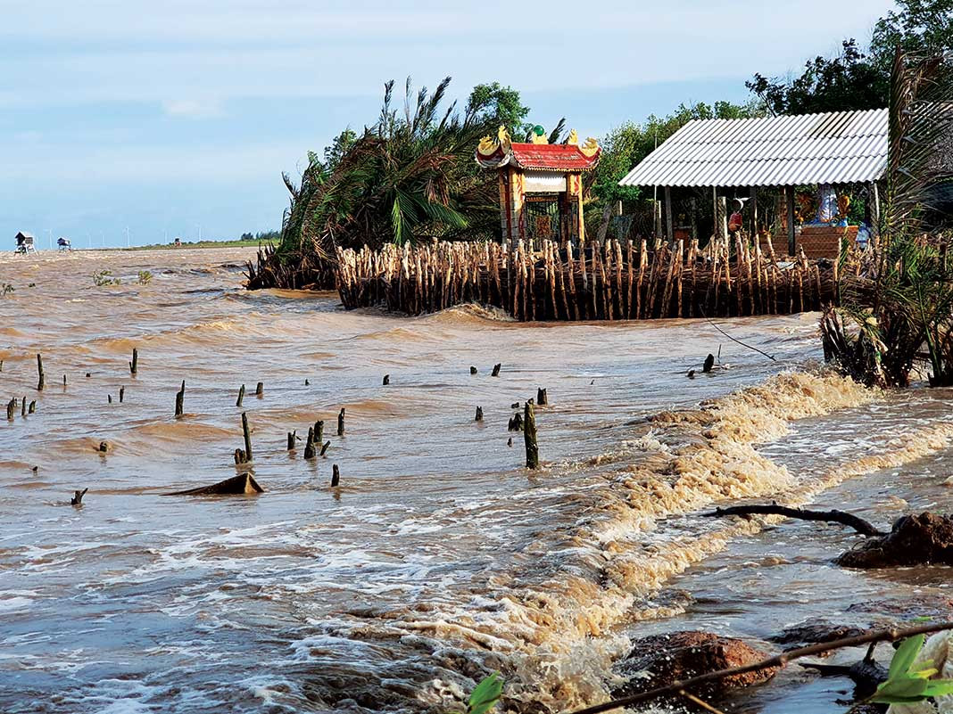 The sea gradually swallows up land as landslides result in the shrinkage of the coastline. As evidence of what happened, Hoang Thi Nga, a resident of Con Cong Hamlet, Phu Tan Commune, Tan Phu Dong District, Tien Giang Province, pointed to the house some 200 meters from the sea dyke and said, “Some 10 years ago, the old sea dyke used to be out there, not in the current position.” The house left by the sea was once used as a shelter for her family to guard the shrimp ponds, their main livelihood at that time. In this area, tens of hectares of shrimp farming areas have disappeared due to coastal landslides. Dia Mau Temple, a famous place of worship in the province, is always at risk of falling into the sea despite the local people’s numerous efforts to reinforce the temple.