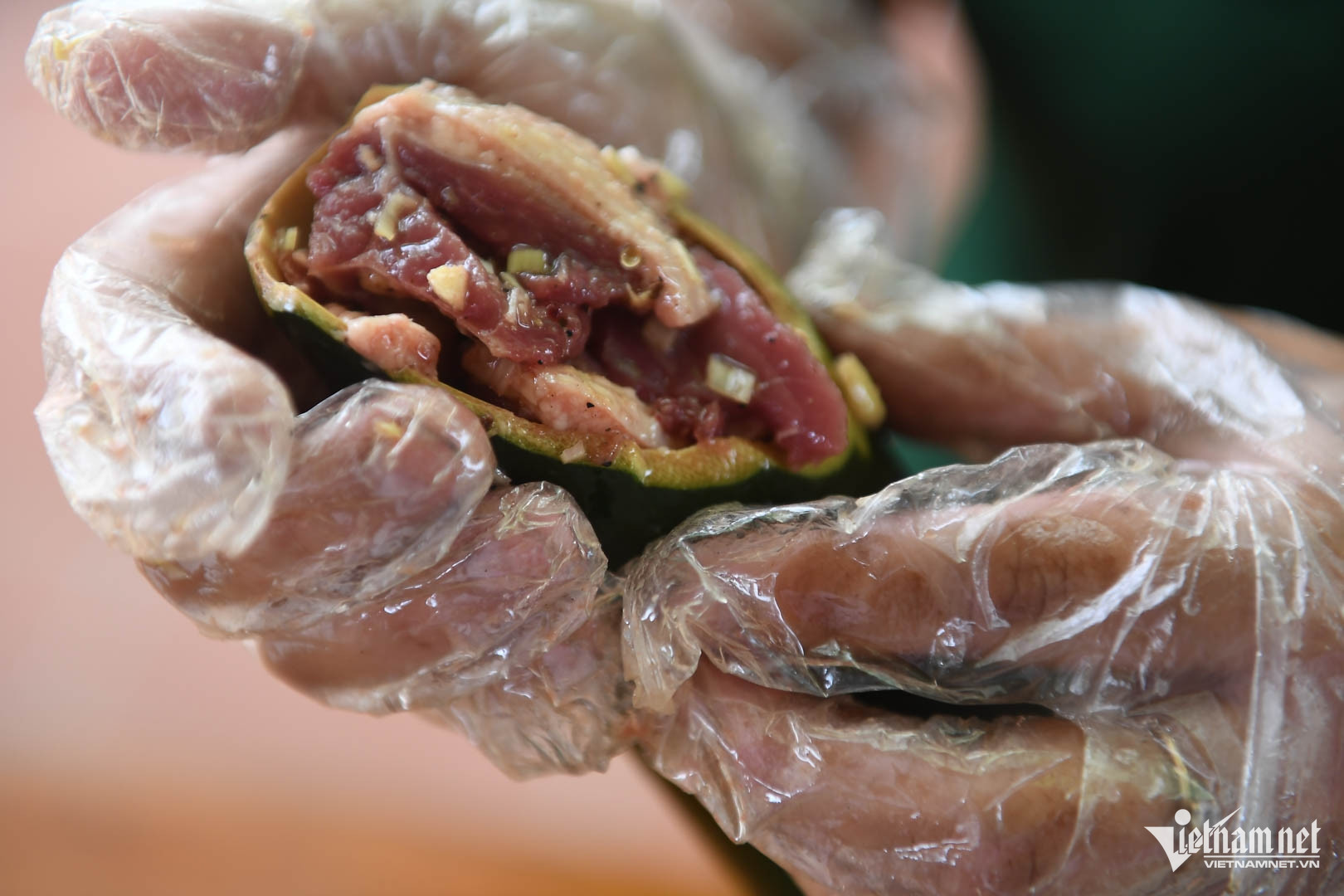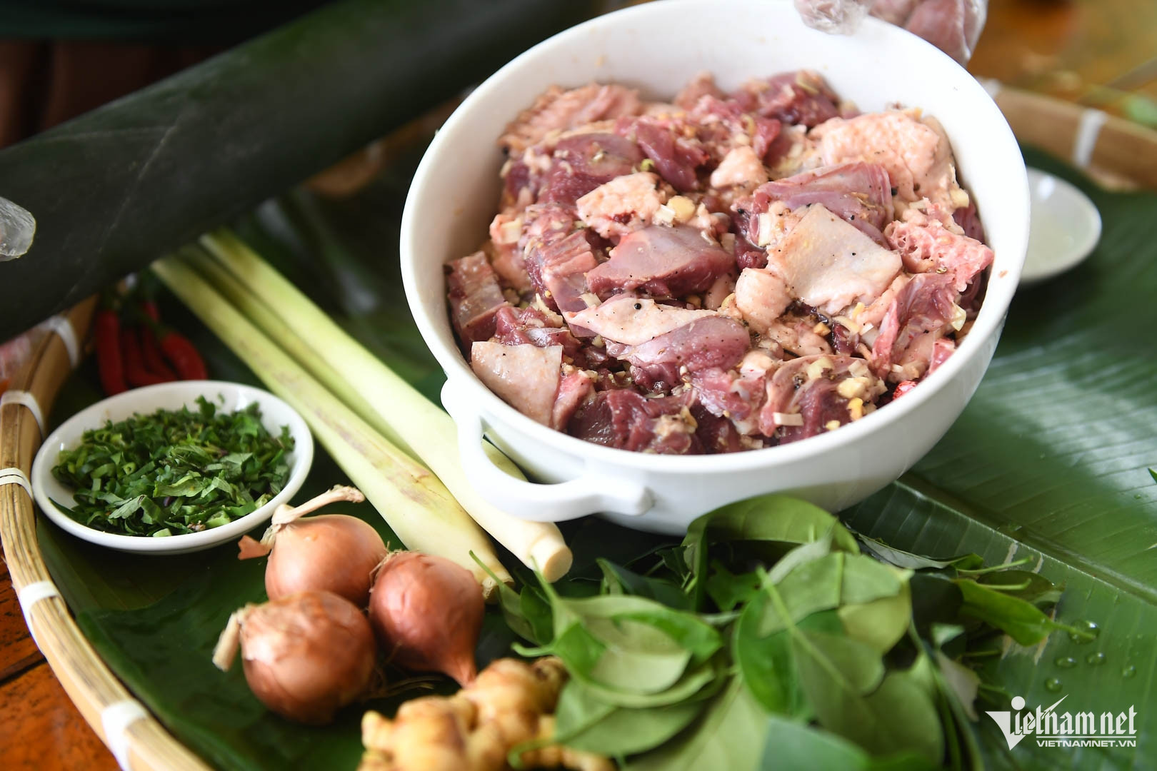 The Da River carp is cleaned and cut into thick pieces, about two-thirds of an adult's palm size. The chef seasons the fish and stuffs it with a mixture of ginger, lemongrass, chili, shallots, pepper, and young papaya leaves, allowing it to marinate for about two hours.
