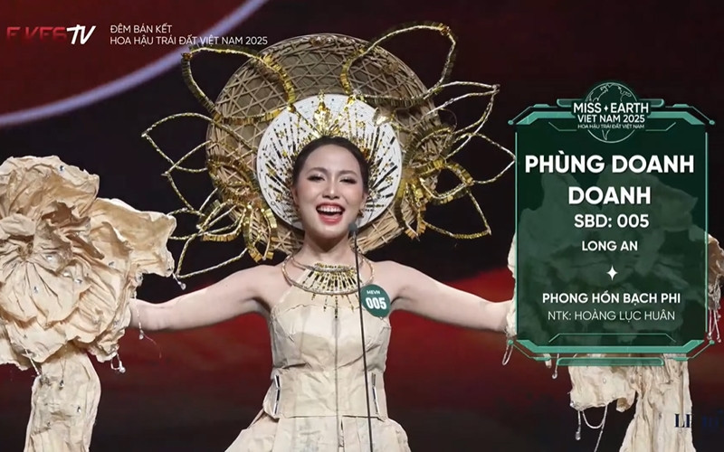 The semifinal night of Miss Earth Vietnam 2025 featured three captivating segments: environmental costume, swimsuit, and ethnic wear. Phung Doanh Doanh stood out by winning the “Best Environmental Costume” award and placed in the top five for the Beach Beauty title.