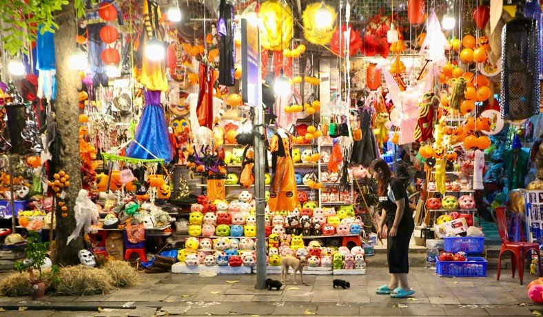 Hang Ma Street is a street in Hanoi that is the go-to spot during the Halloween season. A month ahead of the festival, Hang Ma Street is brightly and magically decorated with a series of mannequins, masks, clothes, colorful lanterns, and scary toys.