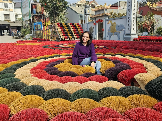 Tâm and other artisans in Quảng Phú Cầu are happy to show tourists the technique of making incense sticks traditionally. It was no problem if anyone wanted to try the producing process from splitting the bamboo tube into thin sticks to dying, shaping and drying them, she said.