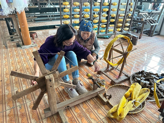 | SILKY SMOOTH: A visitor tries to practise silk spinning with an artisan at Phan Thị Thuận's workshop. VNS Photo Hoàng Quyên |