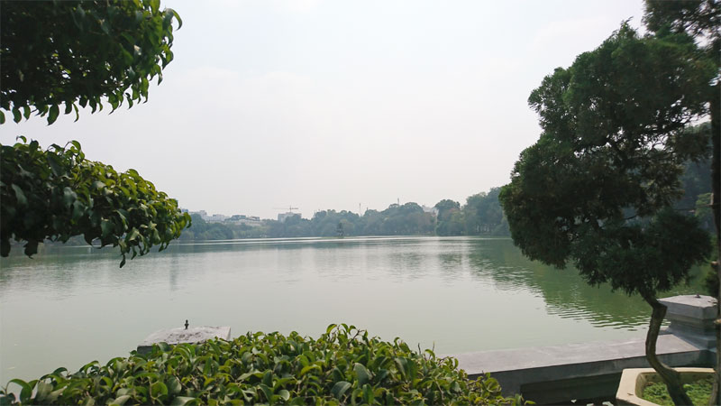 | The tranquil and beautiful scenery of the Hoan Kiem lake, viewing from the gate of Ngoc Son temple. |