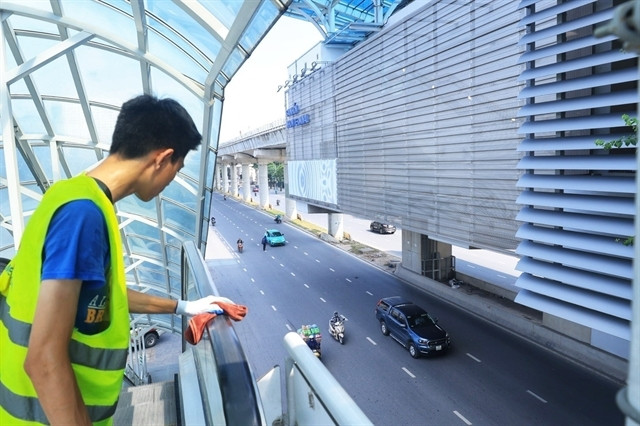 | A worker cleans the stairwell before commercial operation of the elevated section of the Nhổn-Hà Nội Railway Station urban railway line on Wednesday.—VNA/VNS Photo Tuấn Anh |