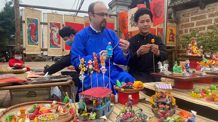 Foreign tourists experience Vietnamese traditional culture in Duong Lam ancient village, Son Tay town, Hanoi. (Photo: NDO)