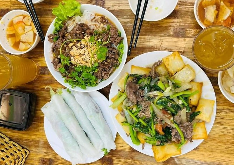| Hanoi's specialties of pho cuon or steamed rice noodles with stir-fried beef and herbs, pho chien phong or crispy fried pho and pho tron or a sweet-and-sour mixture of rice noodles with beef, are served at Pearl Island -Ngu Xa food street. Photo: Pho cuon Huong Mai |