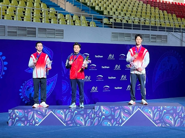 | Nguyễn Văn Khánh Phong of Việt Nam (centre) with his silver in the men's rings of the Asian Men's Artistic Gymnastics Championship 2024. Photo of SAV |