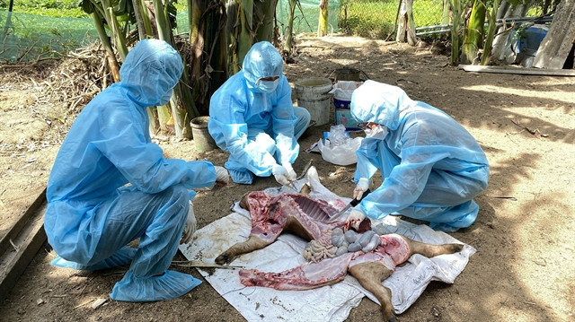 Veterinarians take samples from a pig that died after being injected with NAVET-ASFVAC in the south central province of Phu Yen late last month. Post-vaccination pig death incidents have been reported in three provinces in VN. |