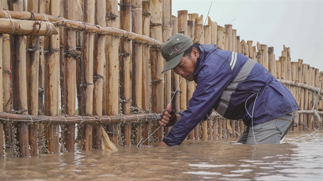 | A local farmer checks a bamboo fence in the wet-land area of Lạc Hòa Commune of Sóc Trăng Province. Volunteers and local residents have planted nearly 20ha of mangroves in the area. — Photo courtesy of Green Happiness |