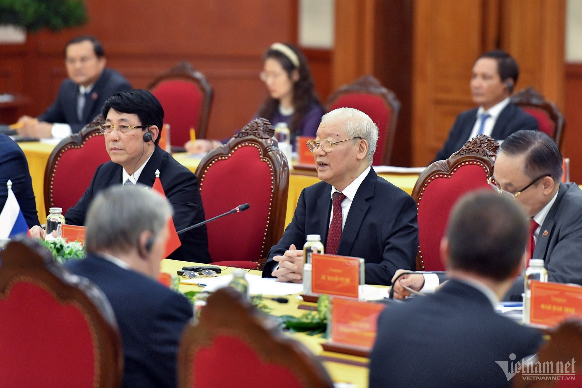 During the meeting, General Secretary Nguyen Phu Trong recalled the tradition of Vietnam-Russia friendship and emphasized the affection of the Vietnamese people for Russia. He shared, "The Vietnamese people and I, having lived and studied in Russia, always remember those years. We always think about the warm relationship with our Russian friends." Photo: Pham Hai.