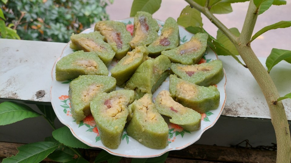 Dai An Khe banh tet attracts diners through the jade green color of the sticky rice layer. This special color comes from katuk, which is crushed and filtered to get the first water, and soaked with the fragrant sticky rice.
