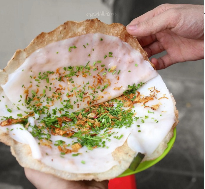 Banh dap combines banh uot (steamed rice pancake) and banh trang (roasted rice paper). Depending on the regions and preference of locals, the dish is prepared differently with various ingredients. The simpler filling is scallion oil while the more sophisticated is minced pork and shrimp with pureed dried shrimp.