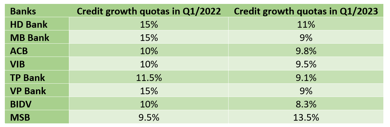 The credit growth limit of HDBank is 11%, MB Bank 9%, ACB 9.8%, VIB 9.5%, TP Bank 9.1%, VPBank 9%, BIDV 8.3% and MSB 13.5%. These rates are lower than the levels last year (see box below).