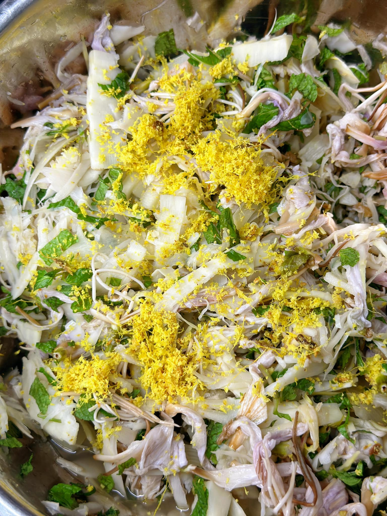 Before mixing, the blanched ban flowers are lightly crushed by hand. Bamboo shoots and finely chopped herbs are then added, along with seasonings such as salt, chili, garlic, sugar, mac khen, minced galangal, and lemon juice. The mixture is tossed thoroughly, left to marinate for 10 to 15 minutes, then combined with the pounded fish.