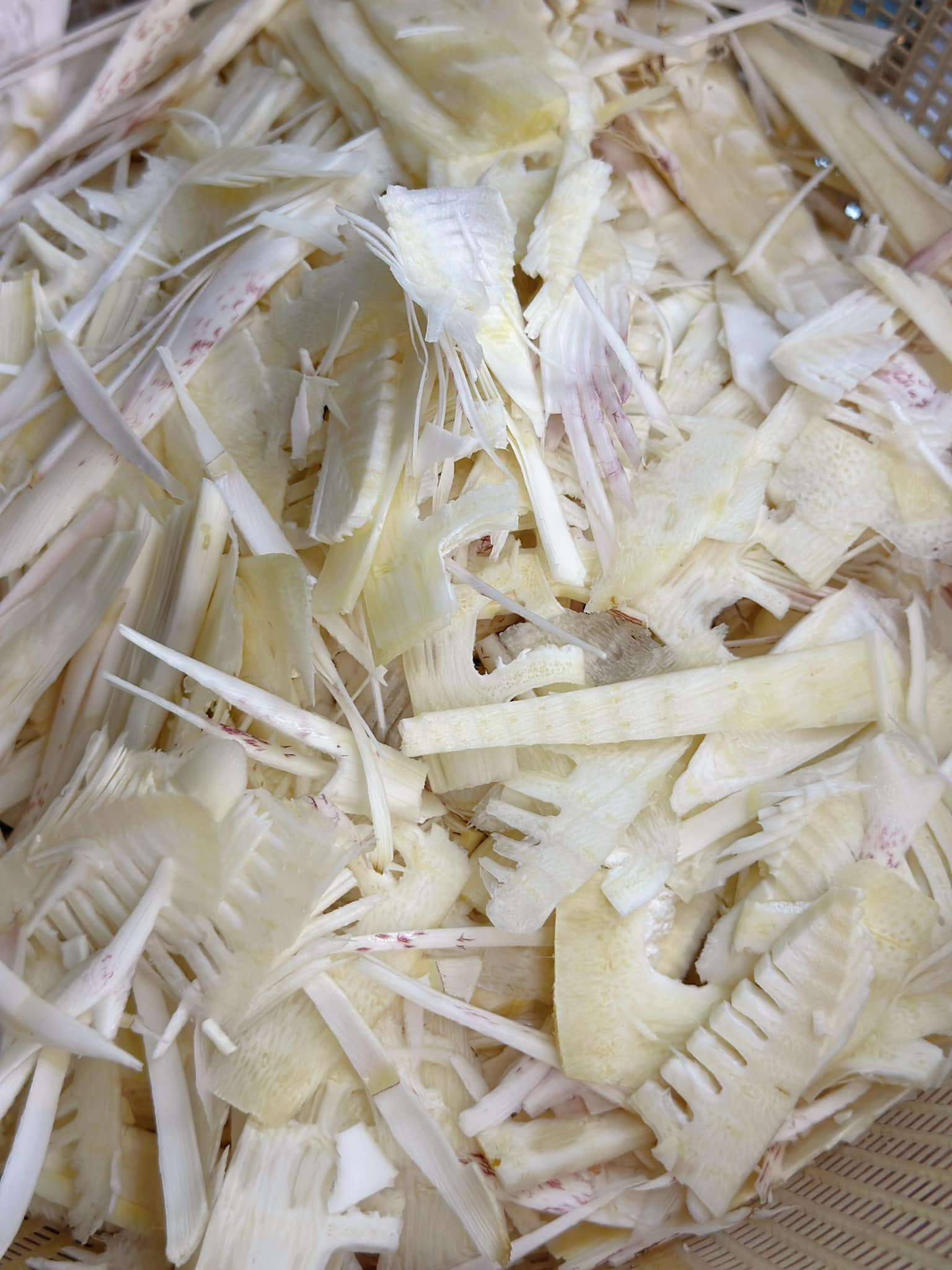 The preparation involves removing the old stems from the ban flowers, keeping only the petals and stamens, then blanching them briefly in boiling water and allowing them to drain. Bitter bamboo shoots are finely sliced, soaked in diluted saltwater, lightly boiled, and drained. Grilled stream fish is deboned and pounded into flakes.