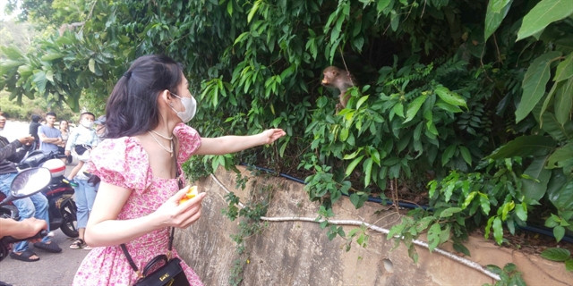 | A visitor feeds food to a monkey in the Sơn Trà Nature Reserve in Đà Nẵng City. Feeding wild animals has caused alarm in the reserve. Photo courtesy Thanh Ngọc Trúc |