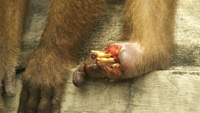 | A limb of a monkey probably injured by a trap or hit by a car in Sơn Trà Nature Reserve in Đà Nẵng City's Sơn Trà Peninsula. Photo courtesy of Thanh Trúc |