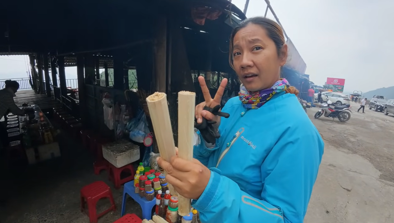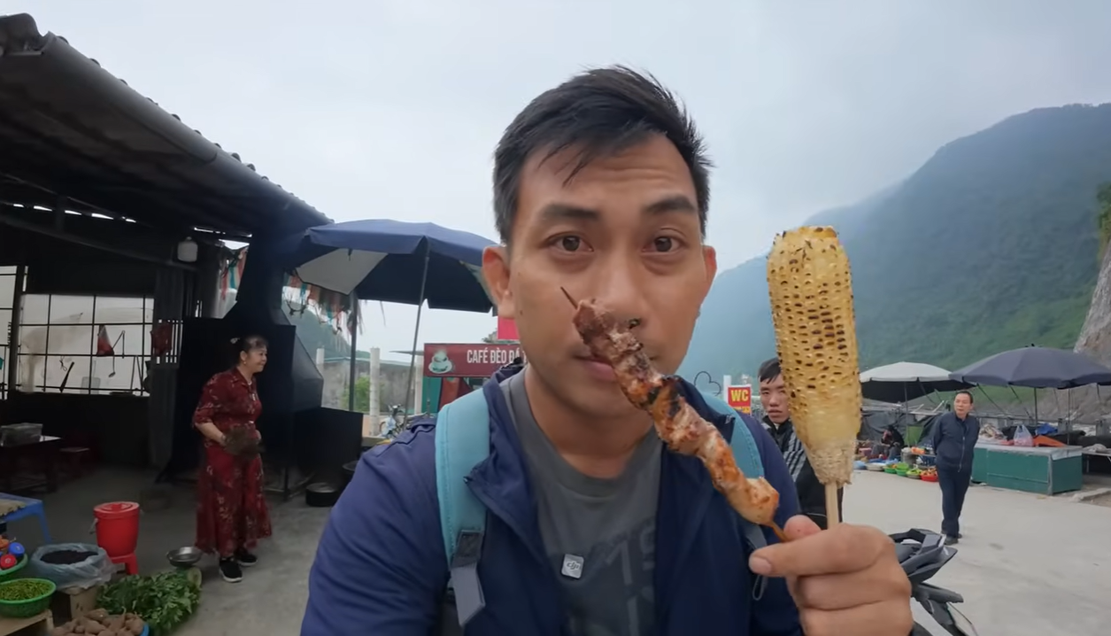 The couple also enjoyed traditional Vietnamese snacks at the foot of the pass, including grilled corn, sticky rice cooked in bamboo (cơm lam), and grilled pork.
