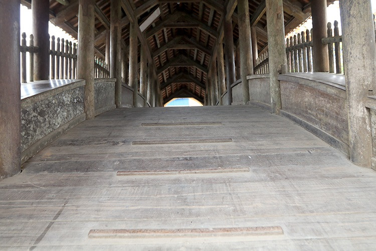 The bridge consists of nine compartments built firmly on 18 square stone pillars. Above the stone pillars is the system of tie-beams and horizontal beams made from Lim (Erythrophloeum Fordi Oliver) timber that prop the bridge’s girder and floor. The 2m wide bridge floor was made from Lim timber. The roof of the bridge is covered with dragon-scale tiles in the shape of a flying dragon.