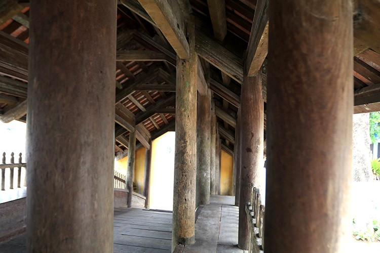 The bridge looks like a long tile-roof house with the upper part being a tile roof with a system of pillars and beams of a traditional house. The lower part is the bridge banisters and floor. The upper and lower parts are combined together using round pillars along the bridge’s banisters and two gates at the two ends of the bridge.