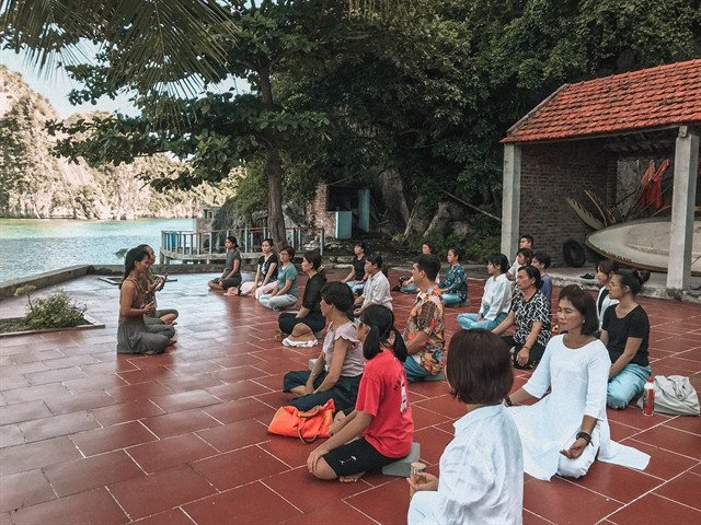 | Tourists join a morning yoga section during their Hạ Long Bay cruise trip by Lumina Retreats. — Photo courtesy of LR |