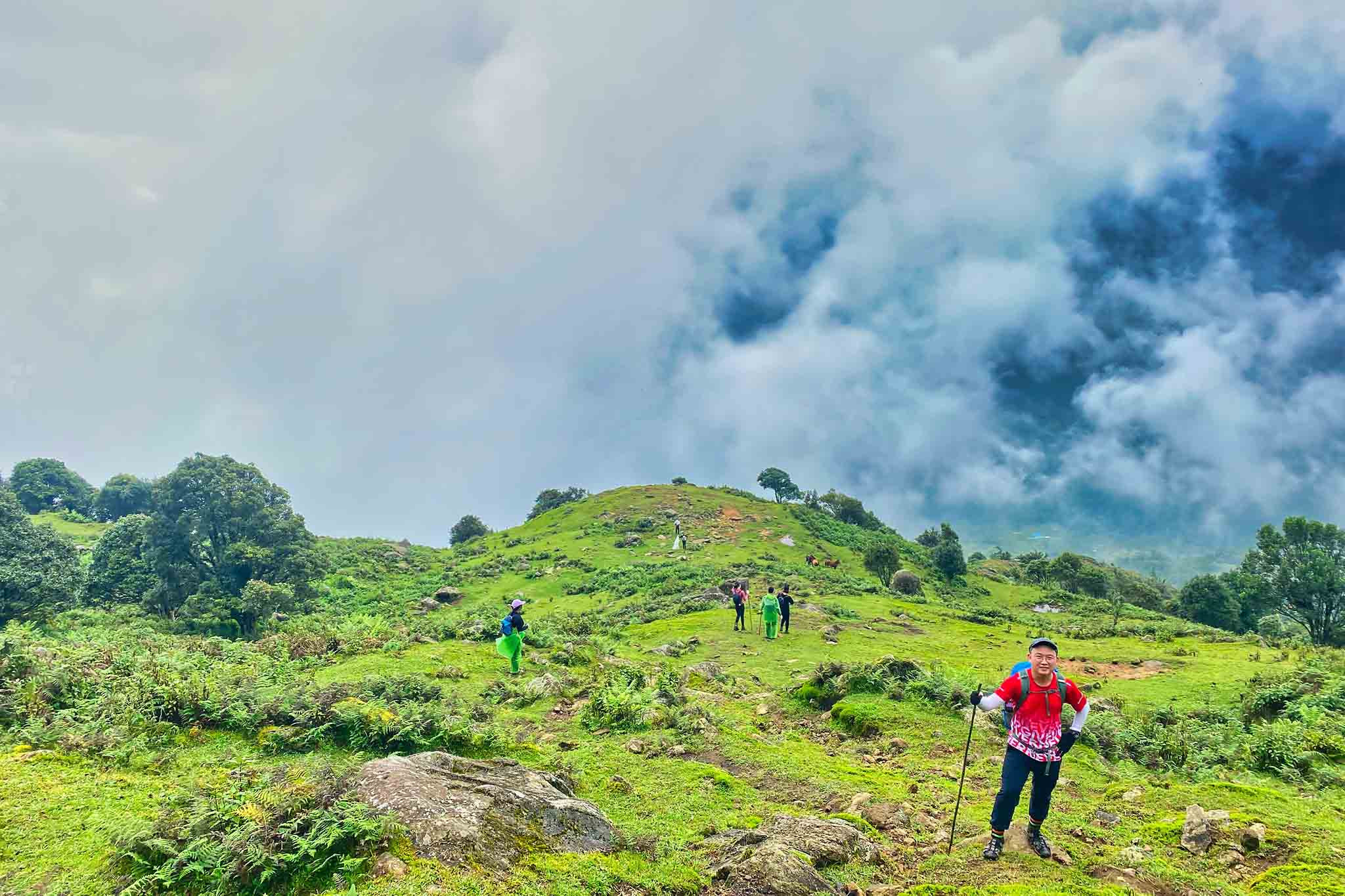 The climbing route traverses a diverse terrain, encompassing streams, waterfalls, bamboo and virgin forests, evergreen grassy hills, and grazing grounds for goats.