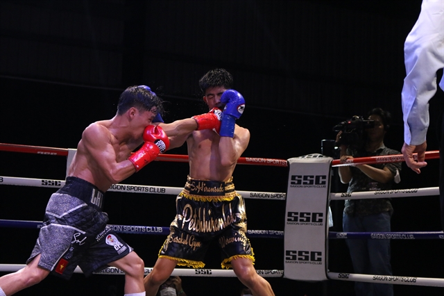 Vietnamese Lê Hữu Toàn (right) lands a punch on Thailand’sKitidech Hirunsukduring theirWBA Asia minimum-weight title match on March 20. — Photocourtesy of Nam Trung