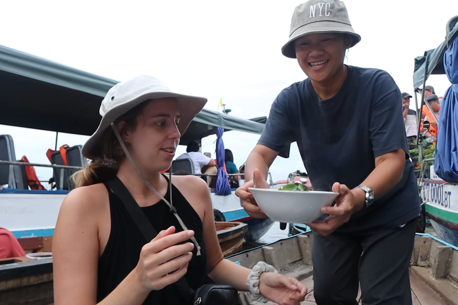 To start their day, they enjoyed breakfast and coffee right on the boat. Their vessel was gently wedged between others as a wooden plank was laid across the boat to serve as a makeshift table. Their guide brought over steaming bowls of noodle soup.
