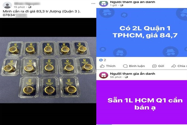 | Gold products are traded at a social media channel. The price of gold rings is offered at VNĐ84-85 million per tael on online forums and groups, VNĐ1-2 million per tael higher than that of licensed gold companies. Photo laodong.vn |