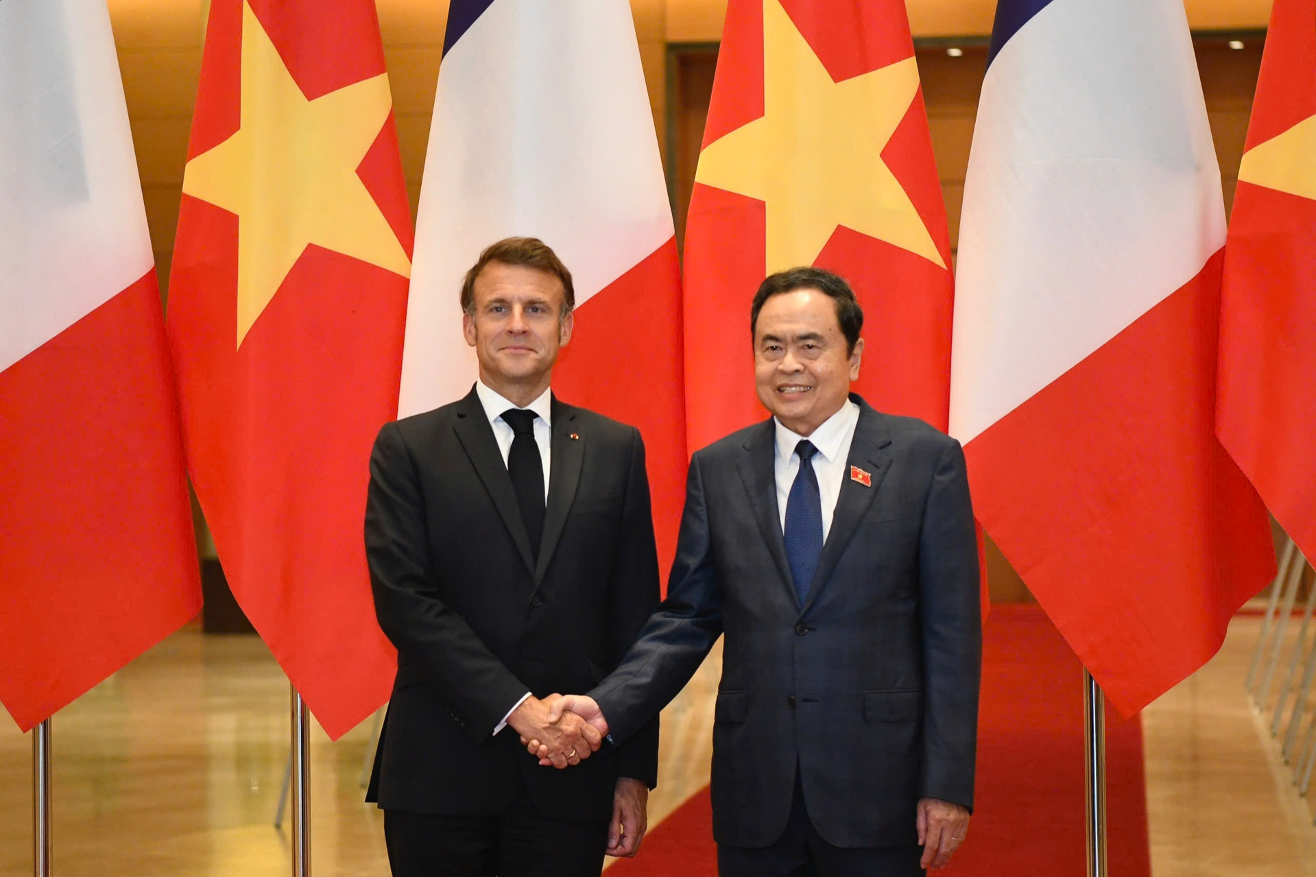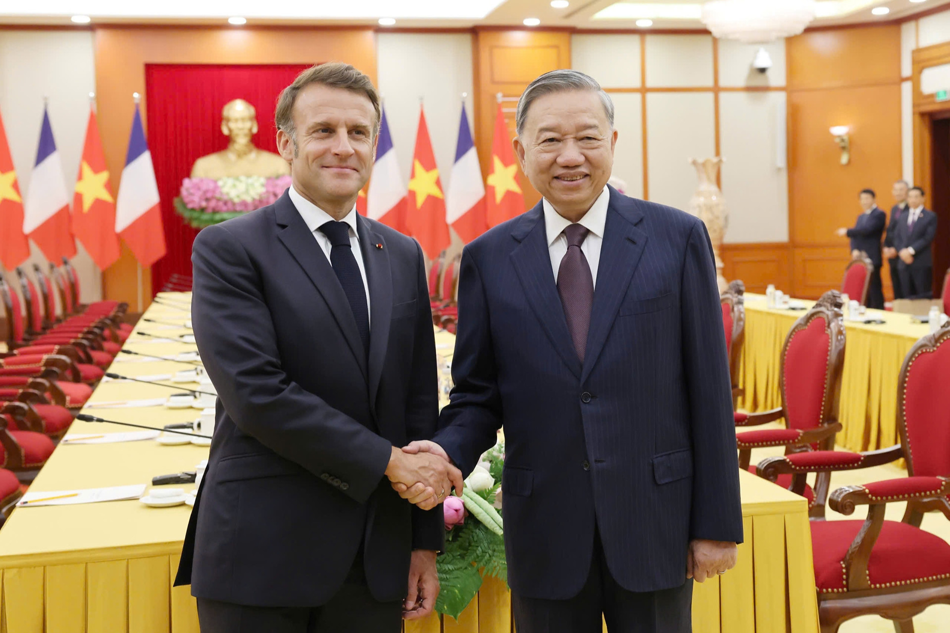 General Secretary To Lam received President Macron. President Luong Cuong chaired the welcoming ceremony, talks, press briefing, and state banquet. National Assembly Chairman Tran Thanh Man also met with Macron.