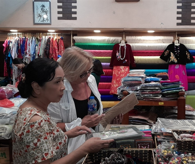 | FOREIGN BUYERS: Many tourists at home and from abroad purchase silk products at Vạn Phúc Silk Village. — VNS Photo Thanh Nga |