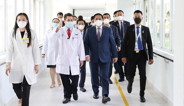 Prime Minister Pham Minh Chinh talks to a patient at Cho Ray-Phnom Penh Hospital (Photo: VNA)