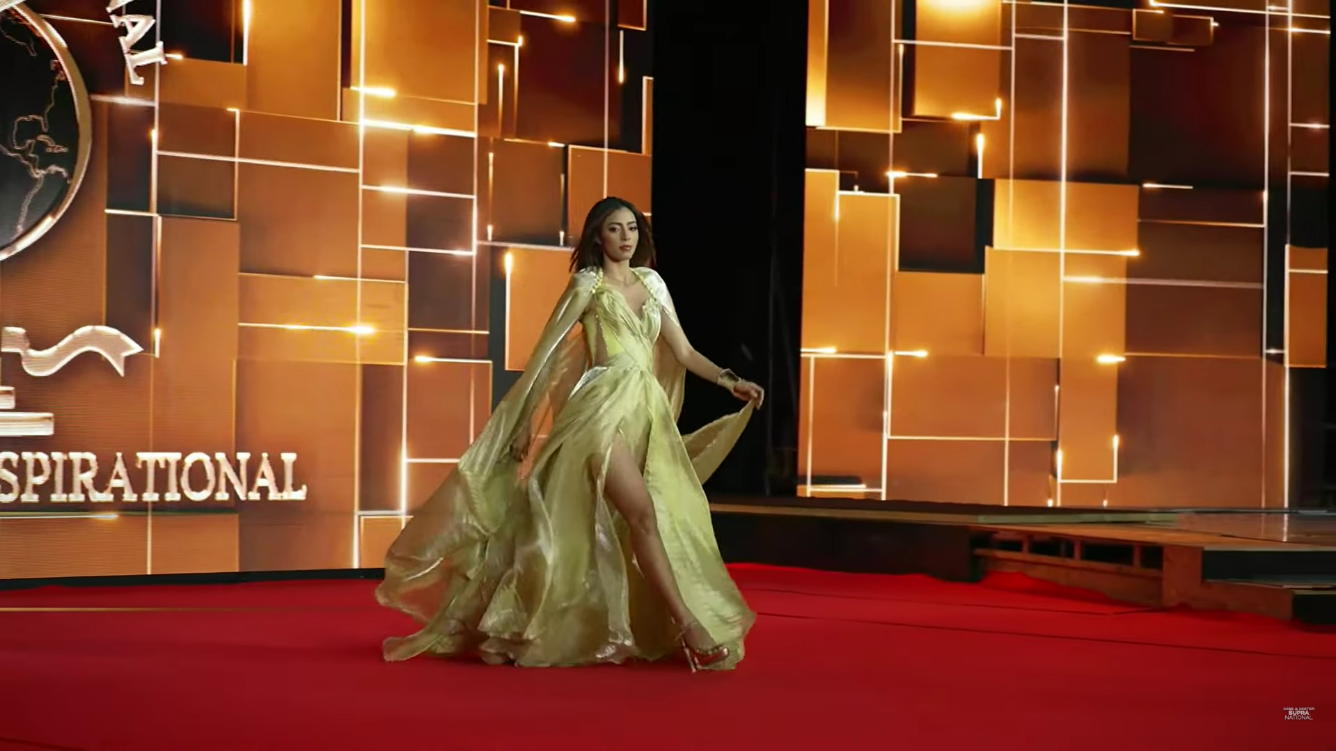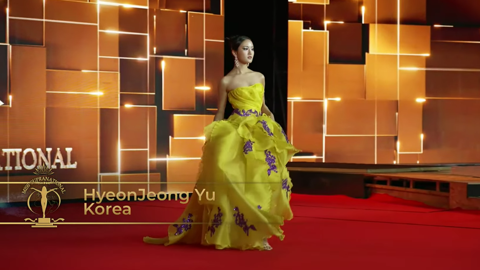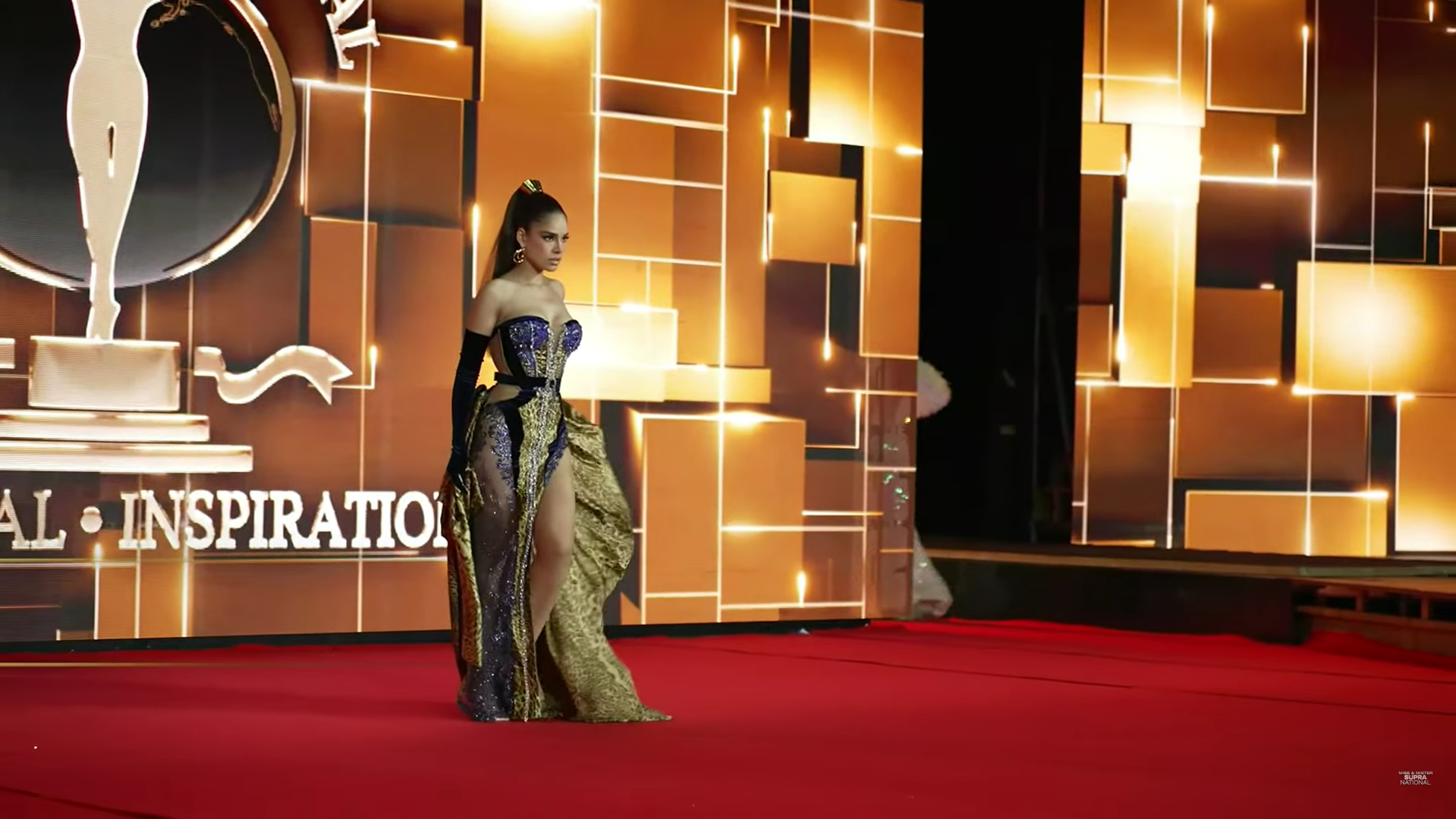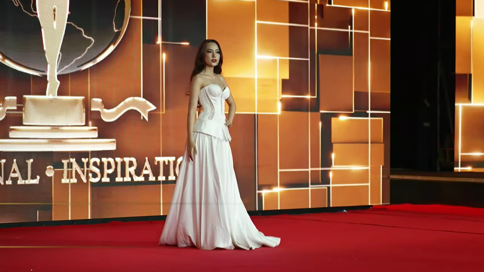 Vietnam's representative, Vo Cao Ky Duyen, stood out in a strapless white gown featuring a corset bodice and high slit, which accentuated her slim waist and long legs. She impressed with her fierce expressions and confident walk.