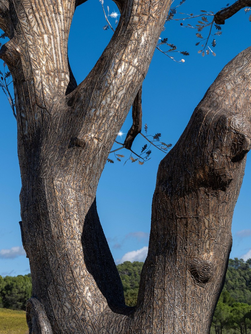 The highlight exhibit is an 18-meter-tall dead dry oak tree at the Château La Coste’s campus. She shaped the artwork based on the original structure of the dead tree and welded several stainless steel leaves on it. Thousands of stainless-steel leaves hanging and "flowers" that are made from colorful, reflective quartz stones on the branches create a sparkle effect as if playing with the sunlight.