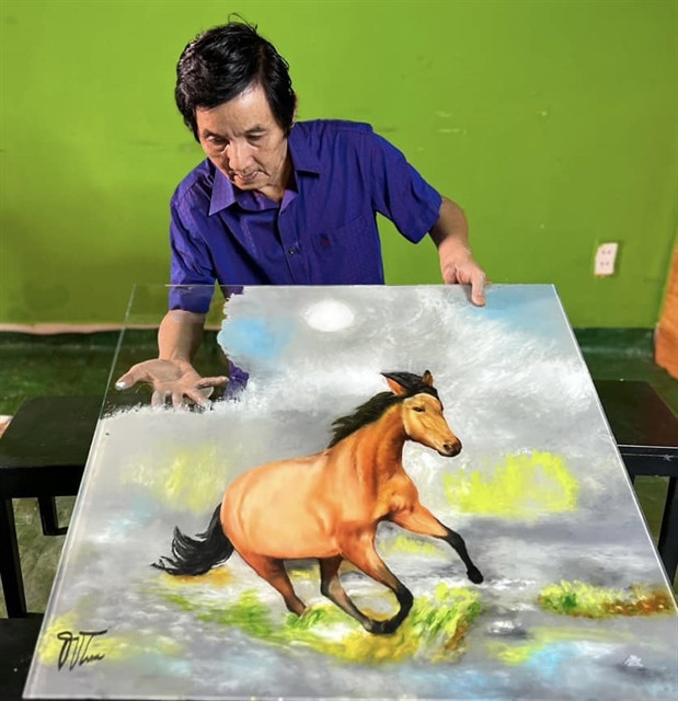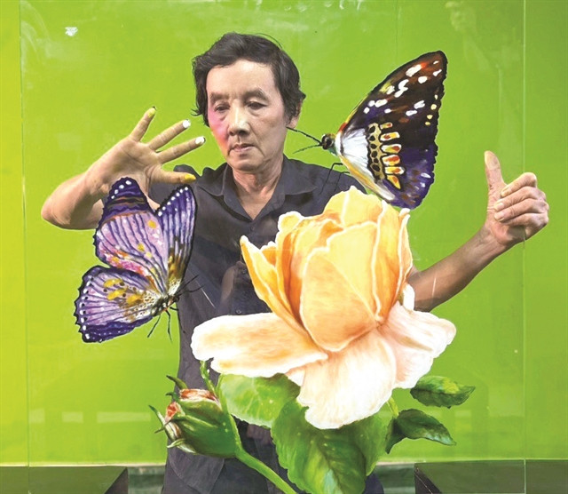This is the second time that Hồ Chí Minh City-based Đoàn Việt Tiến, 63, has set a world record. He has also been honoured for using his 10 fingers, instead of brushes, to paint 12 abstracts on the reverse side of tempered glass, at a time, in six minutes and 24 seconds.
