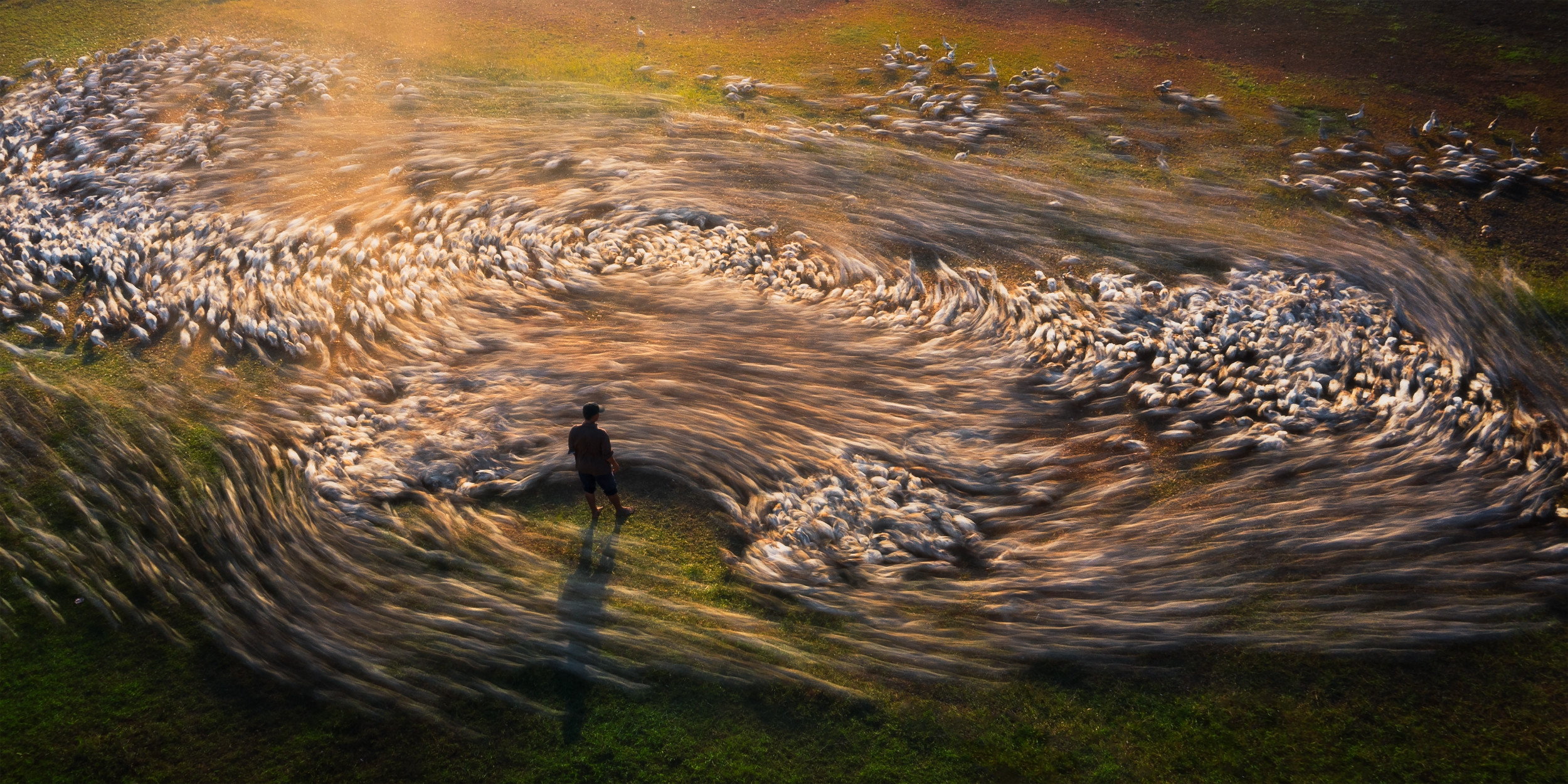 “My intention was to slow down the shutter speed. In this way, with a single static image. I was able to capture the swirling motions of the ducks. At that moment, their movement resembled a vortex,” Nhan wrote about the photograph on website of the awards.