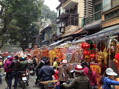 Hang Ma street is coloured red with Tet decorations. People, especially youngsters, come here mainly to take photos