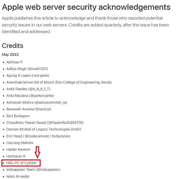 Hieupc, a familiar name to the Vietnamese community of security experts, is one of the 43 names honored by Apple.