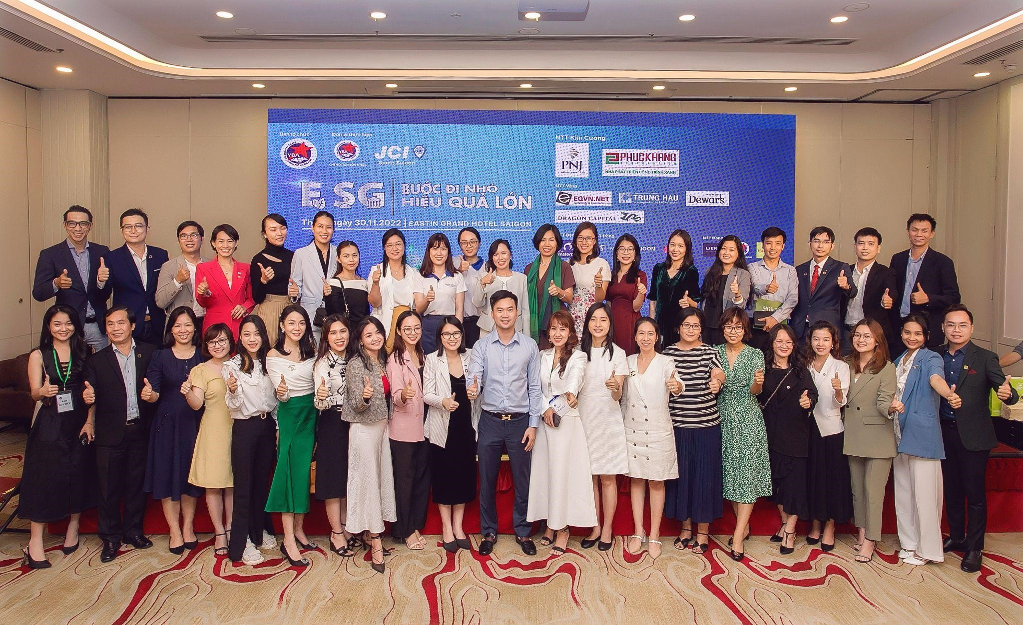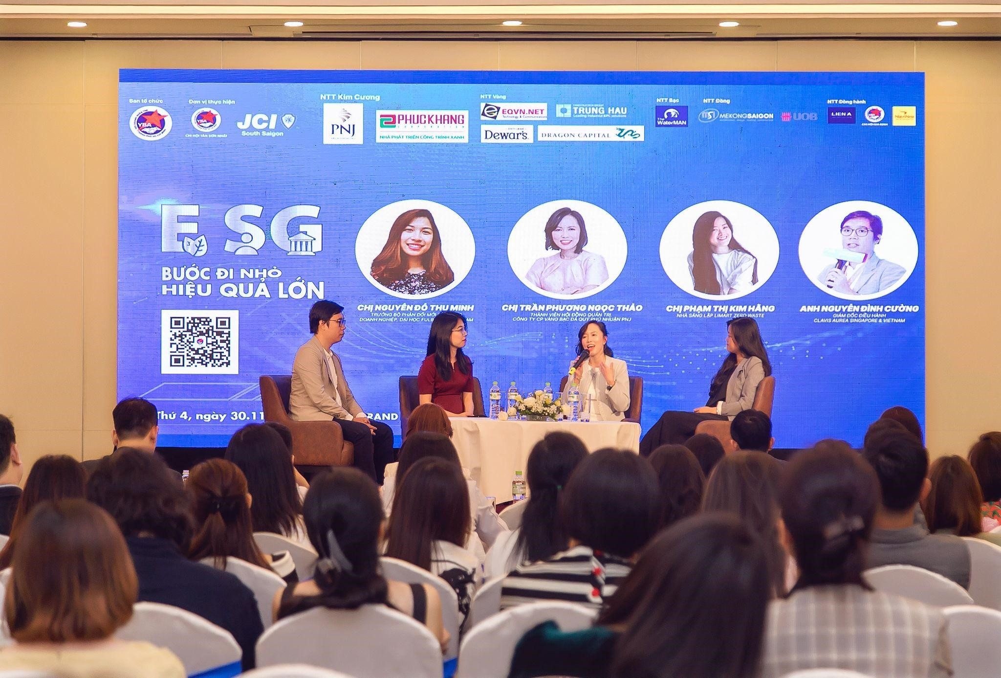 Hội thảo "ESG - Bước đi nhỏ, hiệu quả lớn" diễn ra tại TP HCM, chiều 30/11, do Hội Doanh nhân Trẻ TP HCM và JCI Vietnam tổ chức. Công ty cổ phần Vàng bạc đá quý Phú Nhuận (PNJ) đồng hành chương trình, cùng sự góp mặt của nhiều lãnh đạo doanh nghiệp, hiệp hội, tổ chức quốc tế.