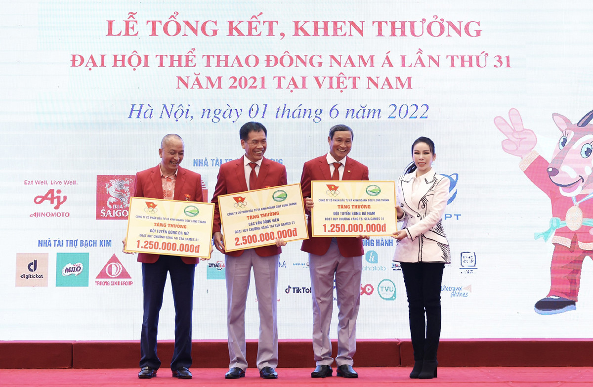 Trong đó, Golf Long Thành tặng thưởng 1,25 tỷ đồng cho đội tuyển bóng đá nam sau chiến thắng ấn tượng trước đội tuyển Thái Lan tại trận chung kết SEA Games 31; tặng 1,25 tỷ đồng cho đội tuyển bóng đá nữ khi bảo vệ thành công chức vô địch và 2,5 tỷ đồng cho các vận động viên đạt huy chương vàng tại SEA Games 31.