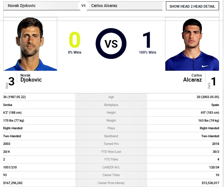 Đây không chỉ giống một trận chung kết sớm, mà còn ảnh hưởng lớn đến bảng thứ bậc trên bảng xếp hạng ATP. Alcaraz chắc chắn bảo vệ vị trí số 1 thế giới nếu đánh bại Djokovic.