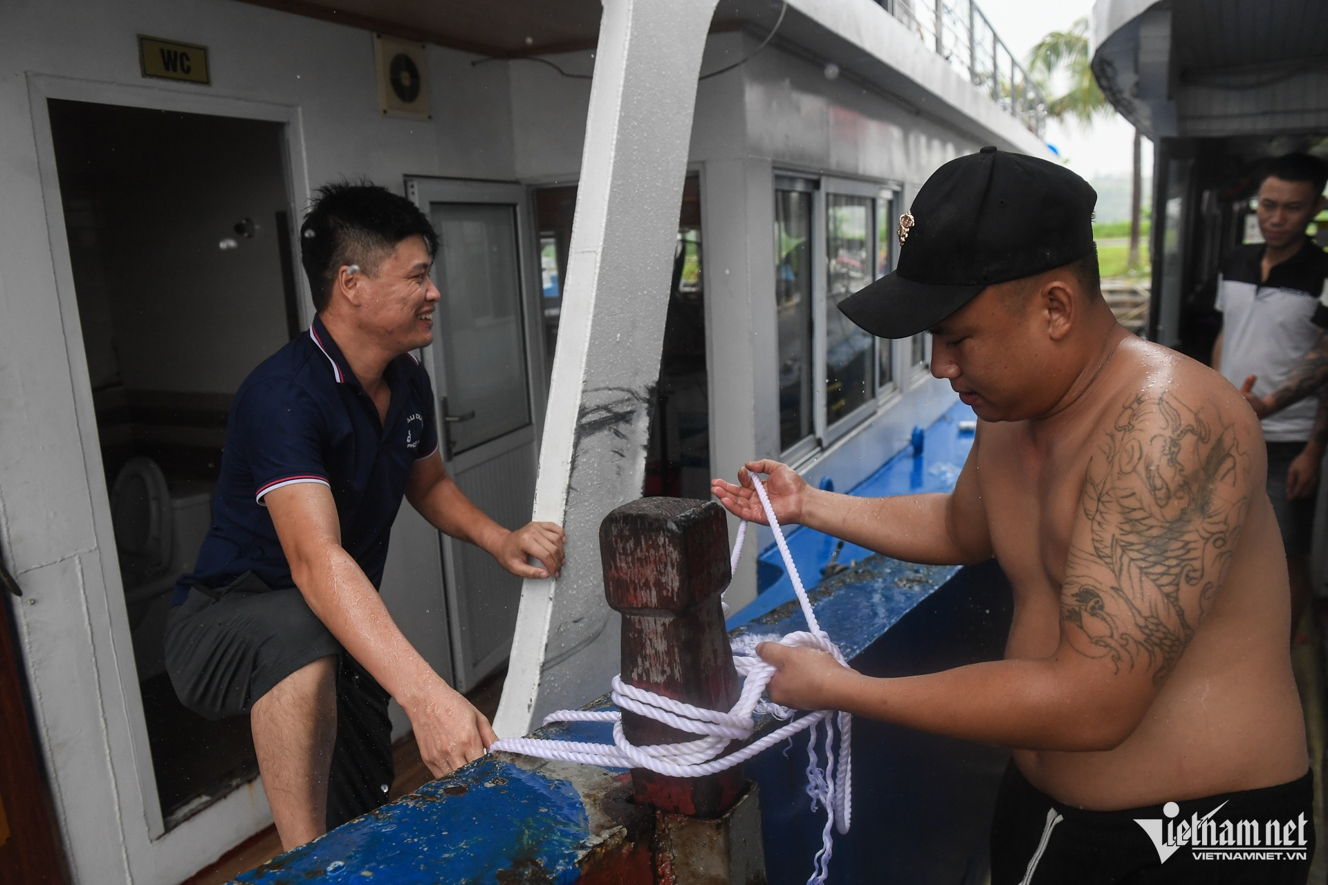 Tàu dừng đón khách, các thuyền viên lúc này tức tốc chuẩn bị công tác chằng néo thuyền bè, thu dọn đồ đạc trước khi bão số 3 đổ bộ.