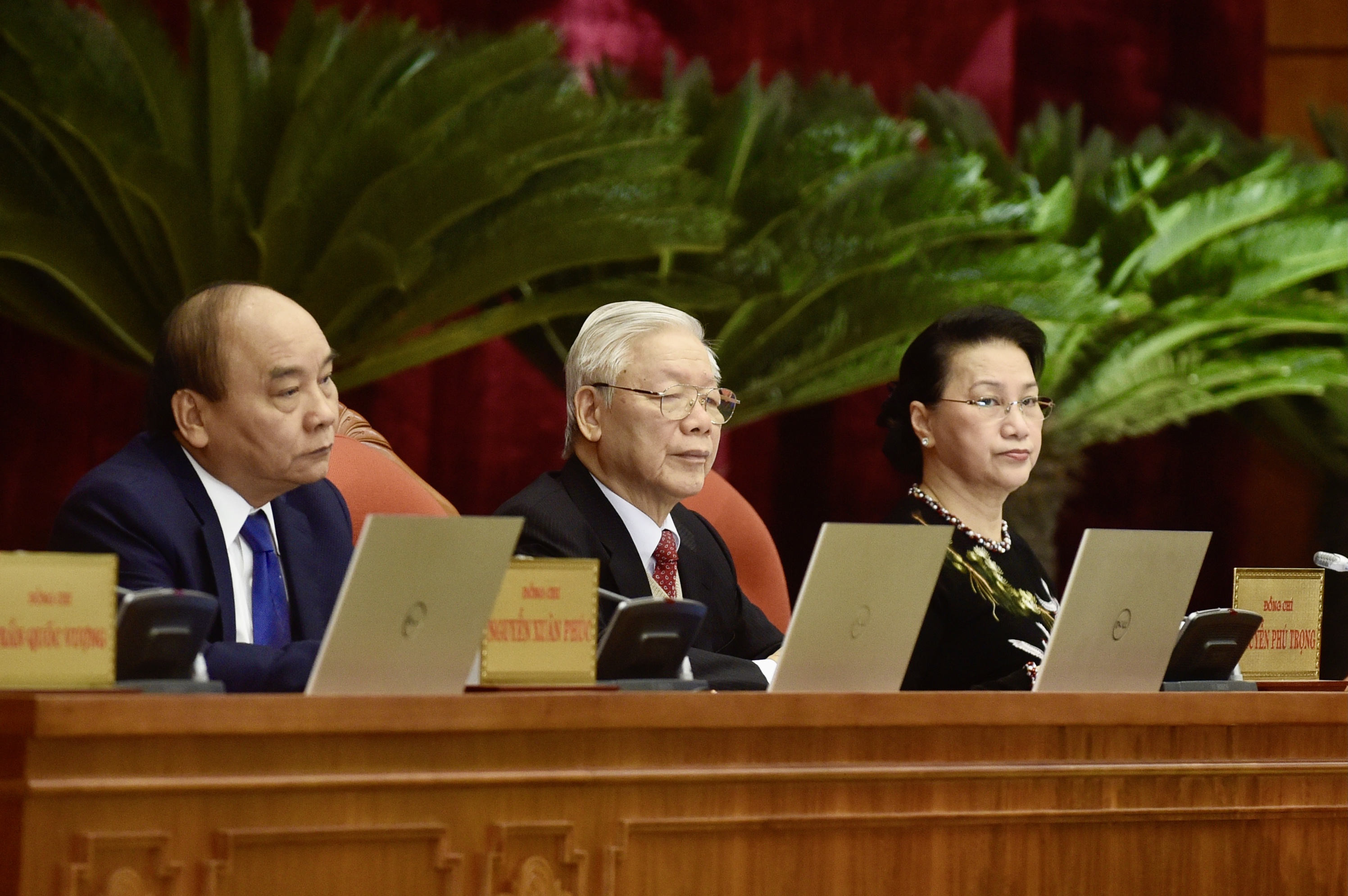 Tổng Bí thư, Chủ tịch nước Nguyễn Phú Trọng, Thủ tướng Nguyễn Xuân Phúc, Chủ tịch Quốc hội Nguyễn Thị Kim Ngân dự hội nghị. Ảnh: VGP/Nhật Bắc |