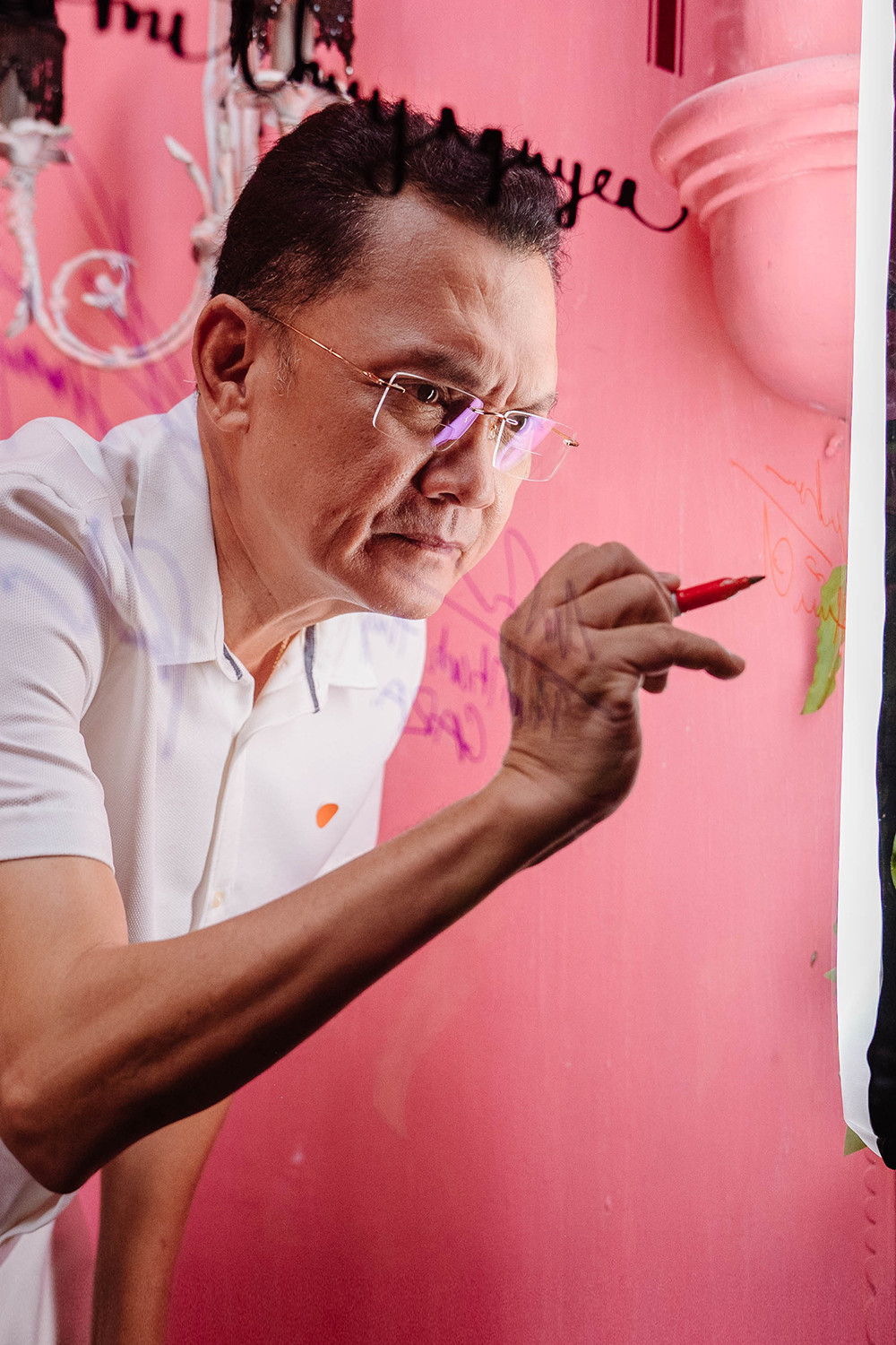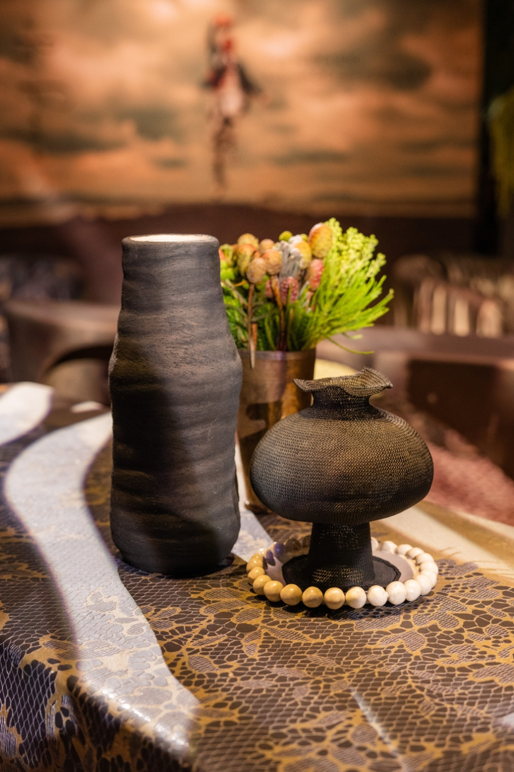 Những chiếc ghế với đường cong đầy cảm xúc trong triển lãm không chỉ là đồ nội thất mà còn là những tác phẩm điêu khắc sống động. Chiếc ghế phủ họa tiết ren truyền thống mang hơi thở cổ điển Sài Gòn xưa, trong khi những tác phẩm với đường nét hiện đại thể hiện sự vận động của thời gian và không gian. Đặc biệt, chiếc ghế bàn ăn với form dáng uốn lượn như dòng chảy sông Sài Gòn khiến nhiều khách tham quan phải dừng lại ngắm nghía. Mỗi chi tiết đều được chạm khắc tỉ mỉ, từ những họa tiết hoa văn tinh xảo đến việc lựa chọn màu sắc hài hòa với tông đỏ ấm áp không gian.
