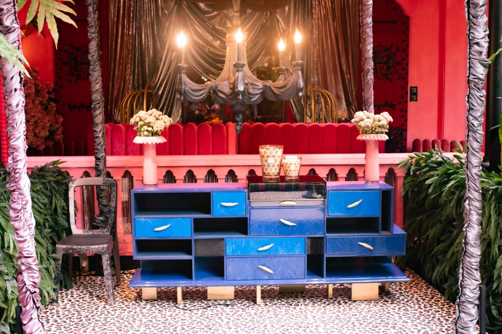 Bộ tủ xanh dương với thiết kế nhiều ngăn kéo thể hiện sự sáng tạo vượt trội trong việc kết hợp màu sắc và chức năng. Màu xanh dương đậm tương phản với nền đỏ tạo nên điểm nhấn bắt mắt, đồng thời gợi nhớ đến màu nước sông và bầu trời Sài Gòn.