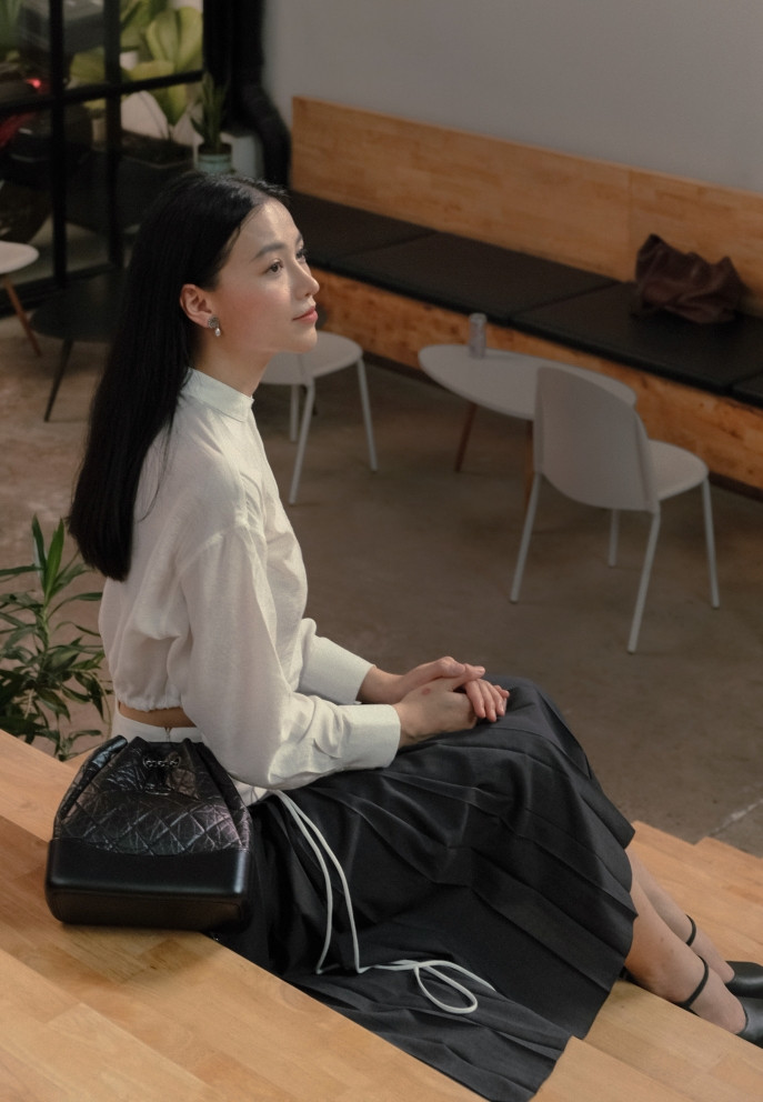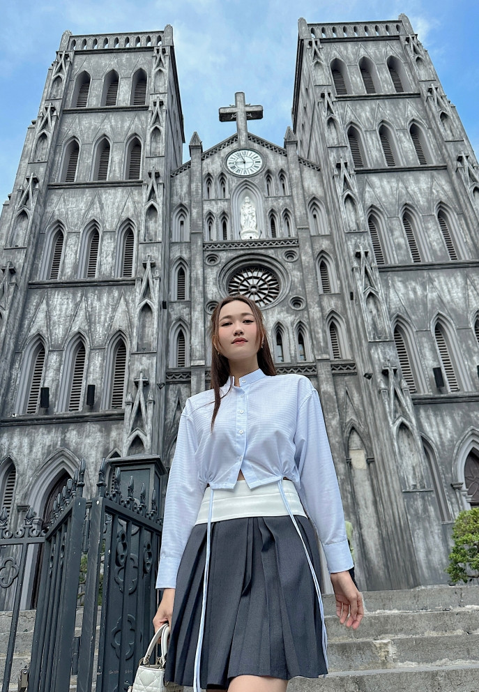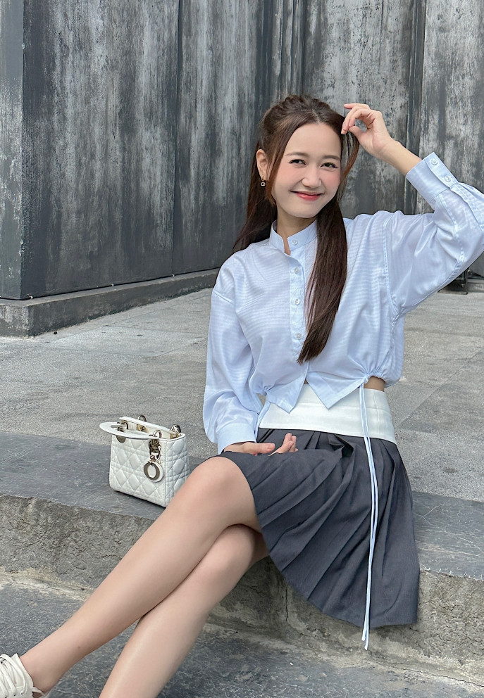 Áo sơ mi croptop cùng chân váy xếp ly hiện đang là một trong những mẫu trang phục được ưa chuộng của giới trẻ trong thời gian gần đây. Phong cách thời trang này giúp khai thác triệt để vóc dáng của người mặc. Bắt kịp xu thế mới, đây là một trong những thiết kế nổi bật của NTK Nguyễn Phương Đông trong BST xuân hè 2023.
