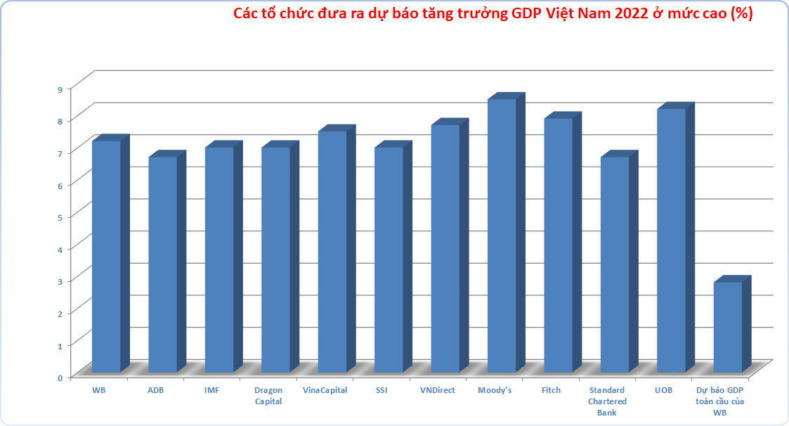 ADB đưa ra dự báo ở mức 6,7%, trong khi SSI ước tính 7%. Moody’s thậm chí dự báo Việt Nam tăng trưởng 8,5% trong năm 2022. VNDirect hồi giữa tháng 9/202, nâng dự báo tăng trưởng GDP Việt Nam năm 2022 từ 7,1% lên 7,7%. Vinacapital nâng dự báo tăng trưởng kinh tế Việt Nam từ 6,5% lên 7,5%.