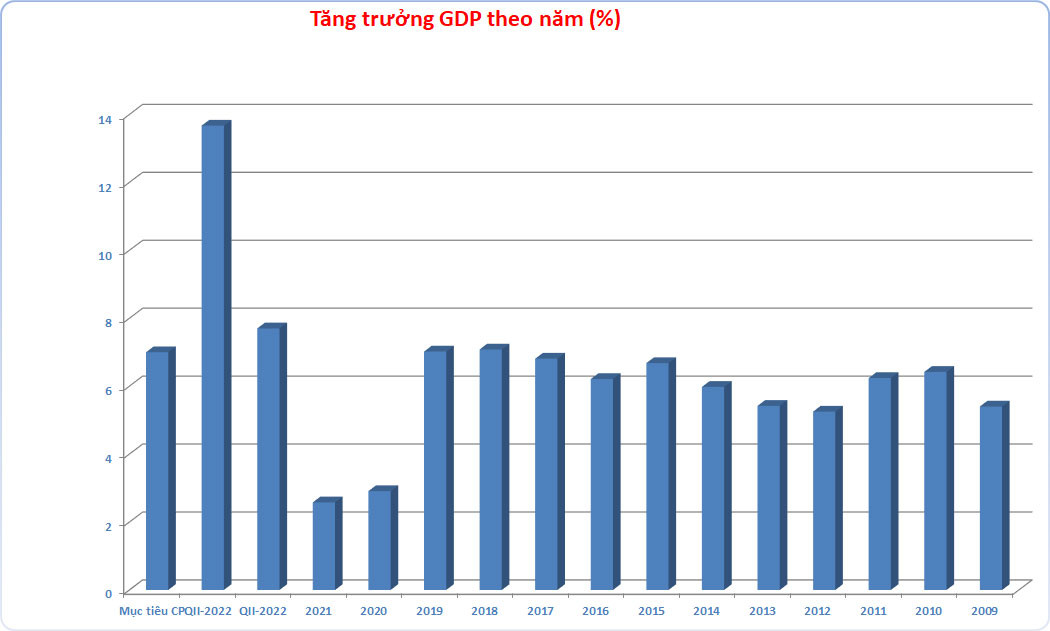 Trong quý III/2022, theo Tổng cục Thống kê, tăng trưởng GDP của Việt Nam đạt 13,67% so với cùng kỳ. Tăng trưởng 3 quý đầu năm đạt 8,83%, cao hơn đáng kể so với mức tăng 6,2% đạt được trong 2 quý đầu năm.